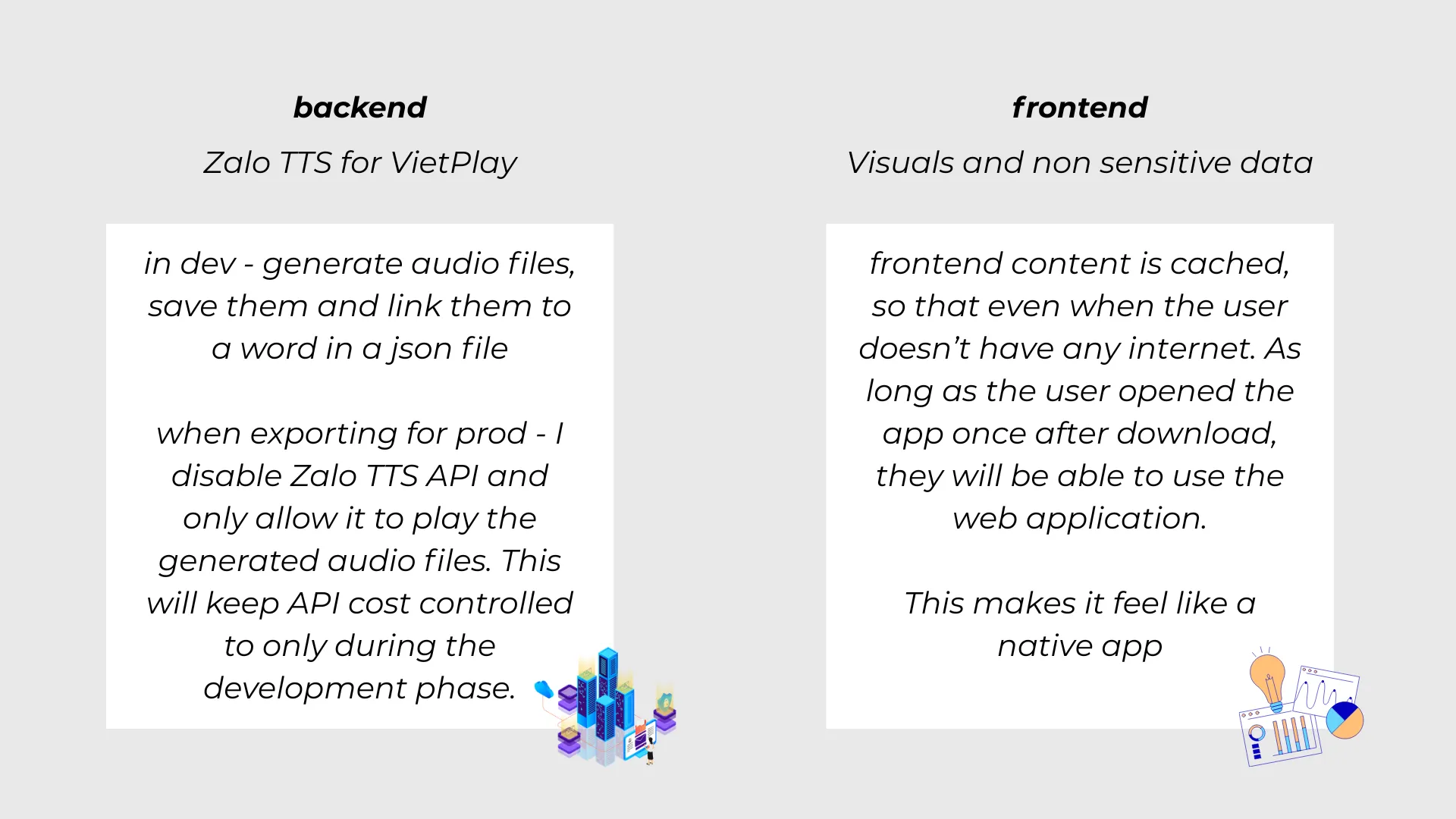 One important example of that last point is VietPlay. Instead of generating everything with TTS on demand, the system uses Zalo TTS for the flashcard words and core sentences, I then save it as mp3, cache and bundle them in the app, removing the TTS API in prod build. This makes sure that we don't run into unexpected API costs due to the app receiving more users.