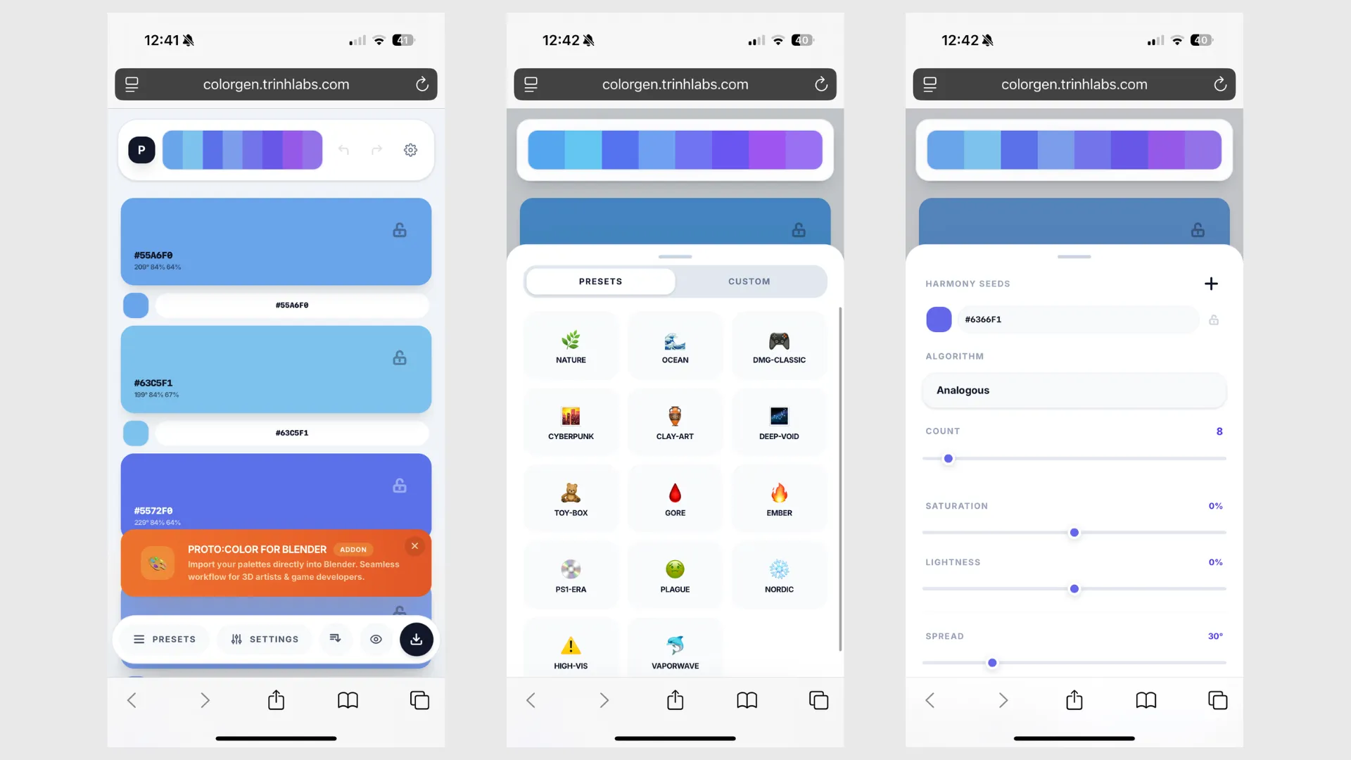 At the product level, these prototypes work as small tests of product direction. Some are mainly exercises in interaction design and clarity. Others also have strategic value. ColorGen is the clearest example. It is useful as a free standalone web tool, but it also lets artists encounter the PROTO:COLOR workflow before deciding whether they want a deeper Blender tool.